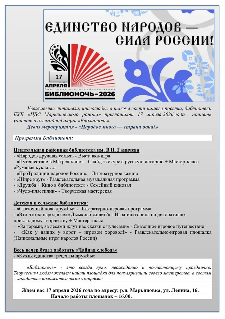 Уважаемые читатели, книголюбы, а также гости нашего поселка, библиотеки БУК «ЦБС Марьяновского района» приглашают 17 апреля 2026 года принять участие в ежегодной акции «Библионочь».